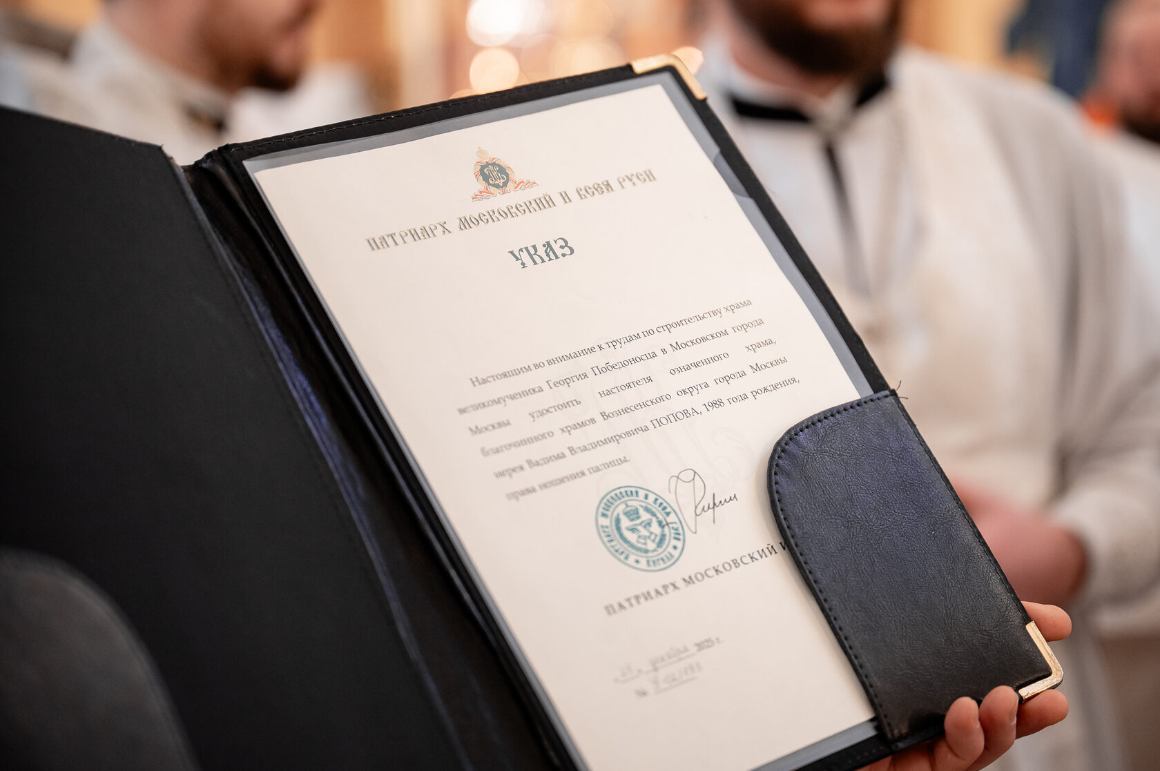 Клирик храма свящ. Павел Мальнов, секретарь Вознесенского благочиния П.А. Лукьянов – патриаршими грамотами.